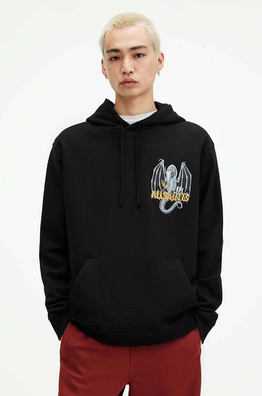 AllSaints hanorac de bumbac DRAGONSKULL barbati, culoarea negru, cu glugă, cu imprimeu