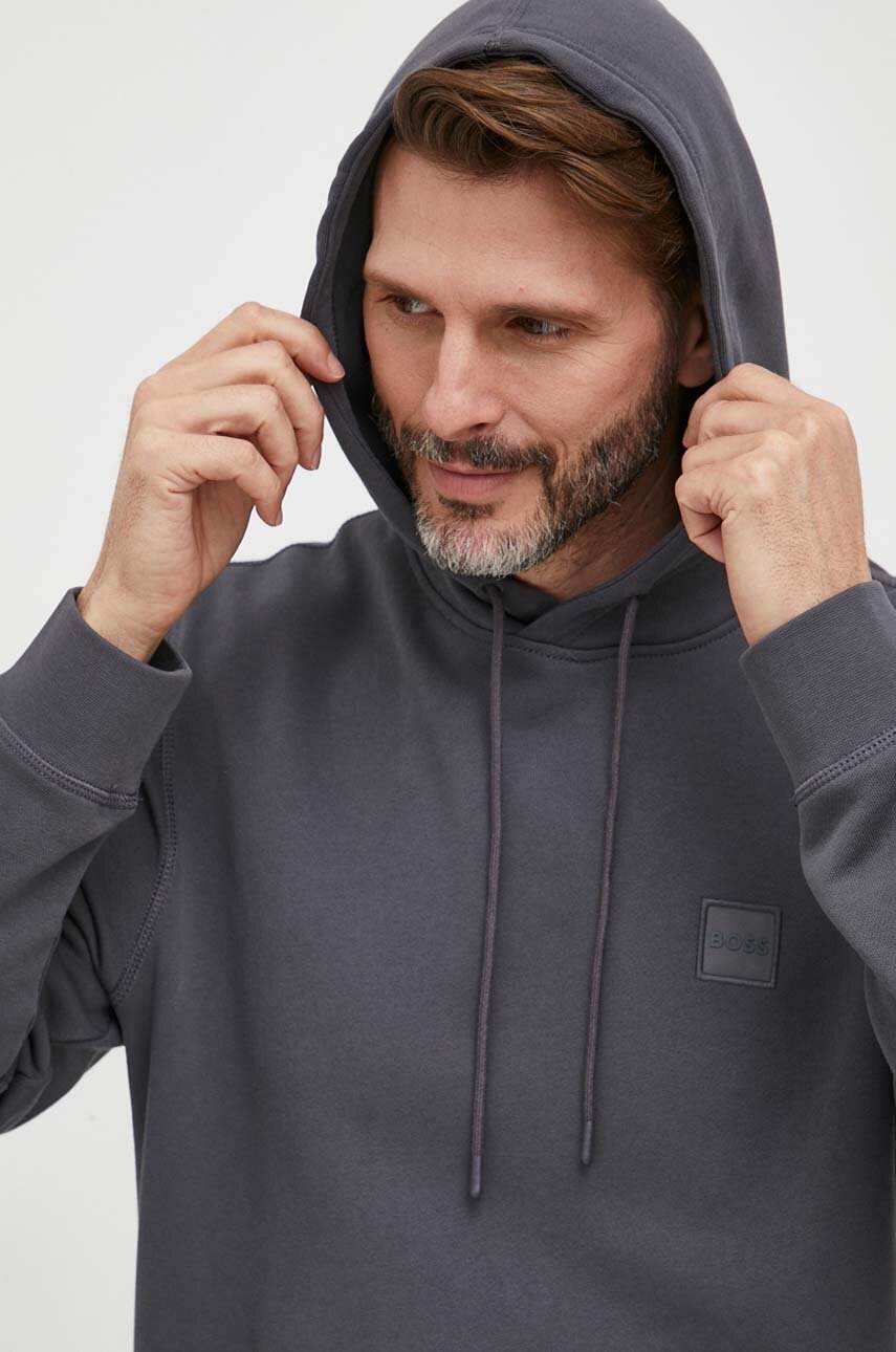 BOSS hanorac de bumbac BOSS CASUAL barbati, culoarea gri, cu glugă, neted