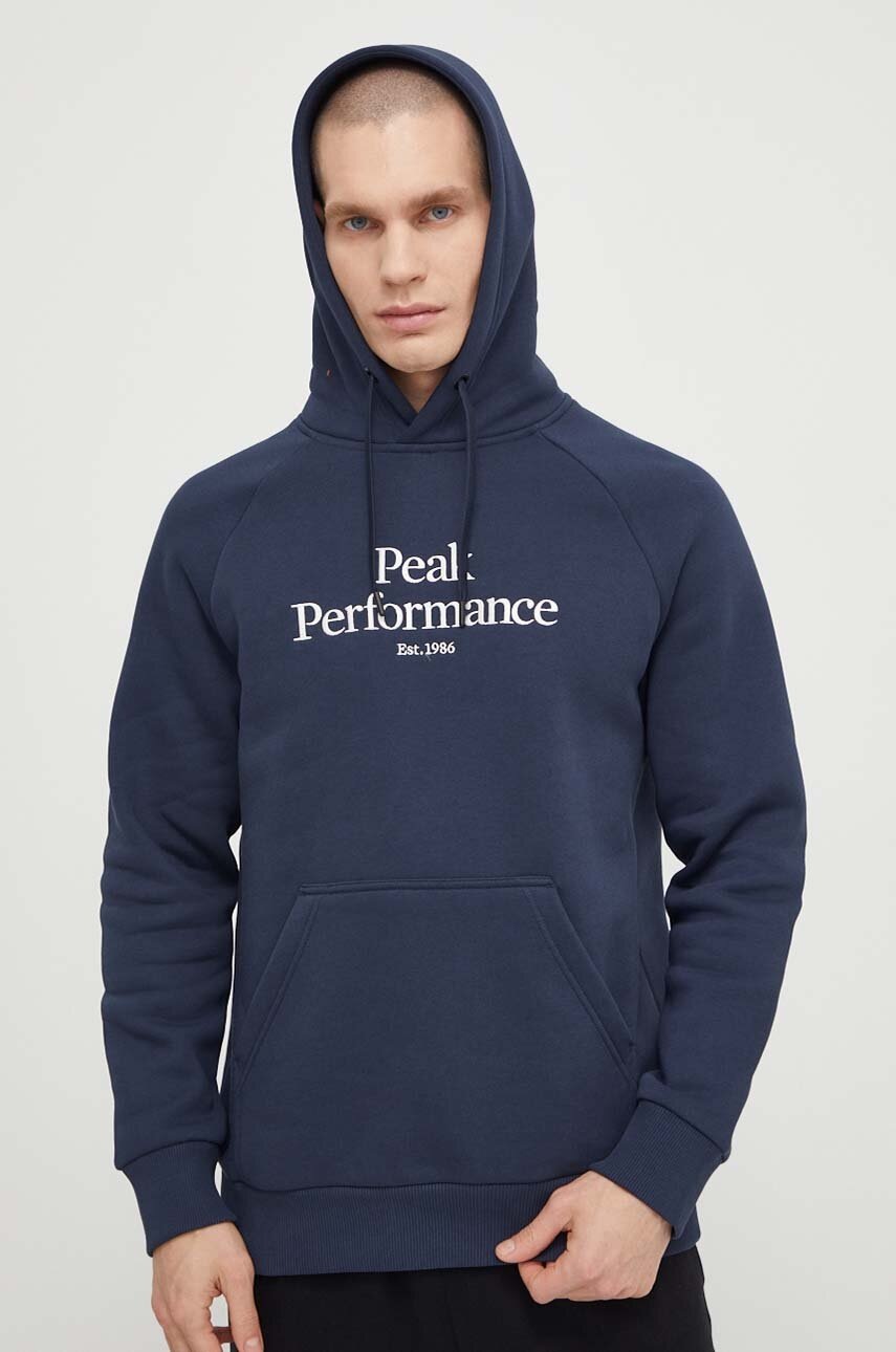 Peak Performance bluza barbati, culoarea albastru marin, cu glugă, cu imprimeu