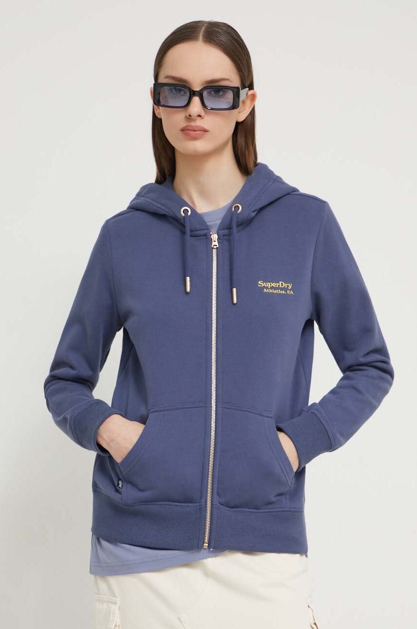 Superdry hanorac de bumbac femei, culoarea albastru marin, cu glugă, cu imprimeu