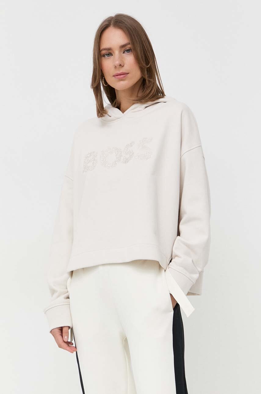 Boss Orange hanorac de bumbac BOSS ORANGE femei, culoarea bej, cu glugă, cu imprimeu