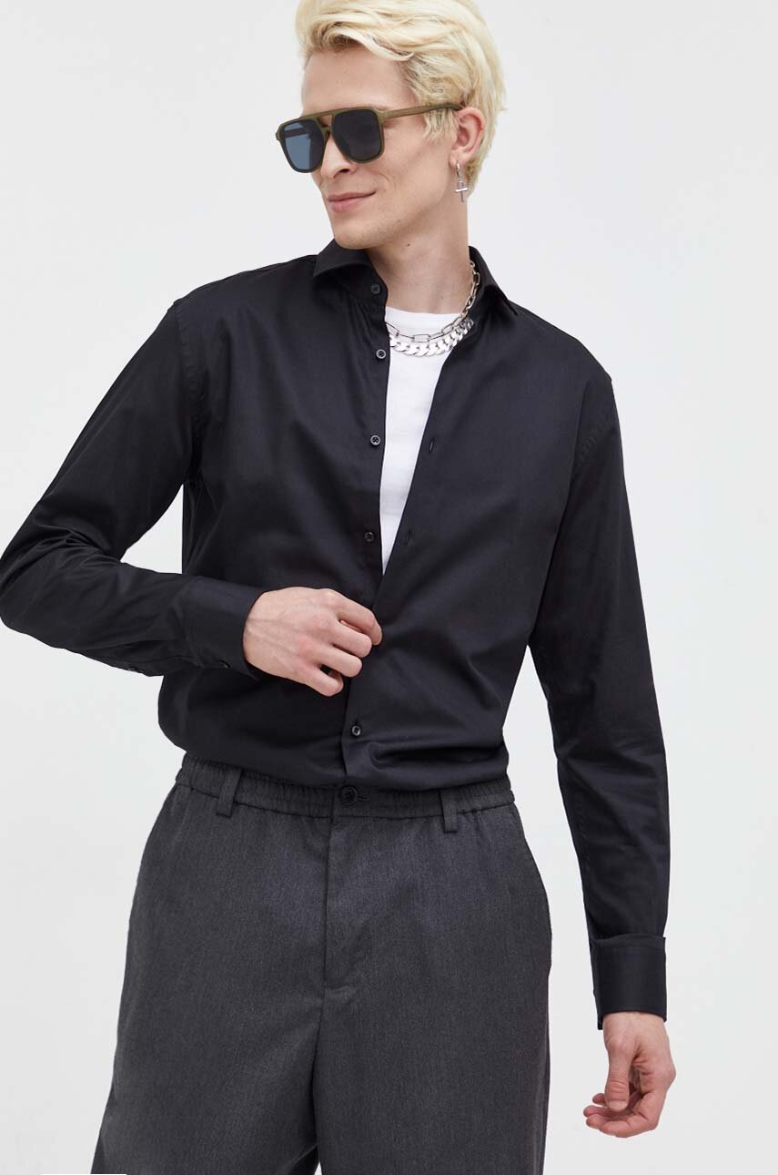 HUGO camasa din bumbac barbati, culoarea negru, cu guler italian, slim