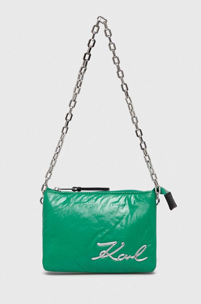 Geantă din colecția Karl Lagerfeld. Model cu fixare confecționat din material textil.