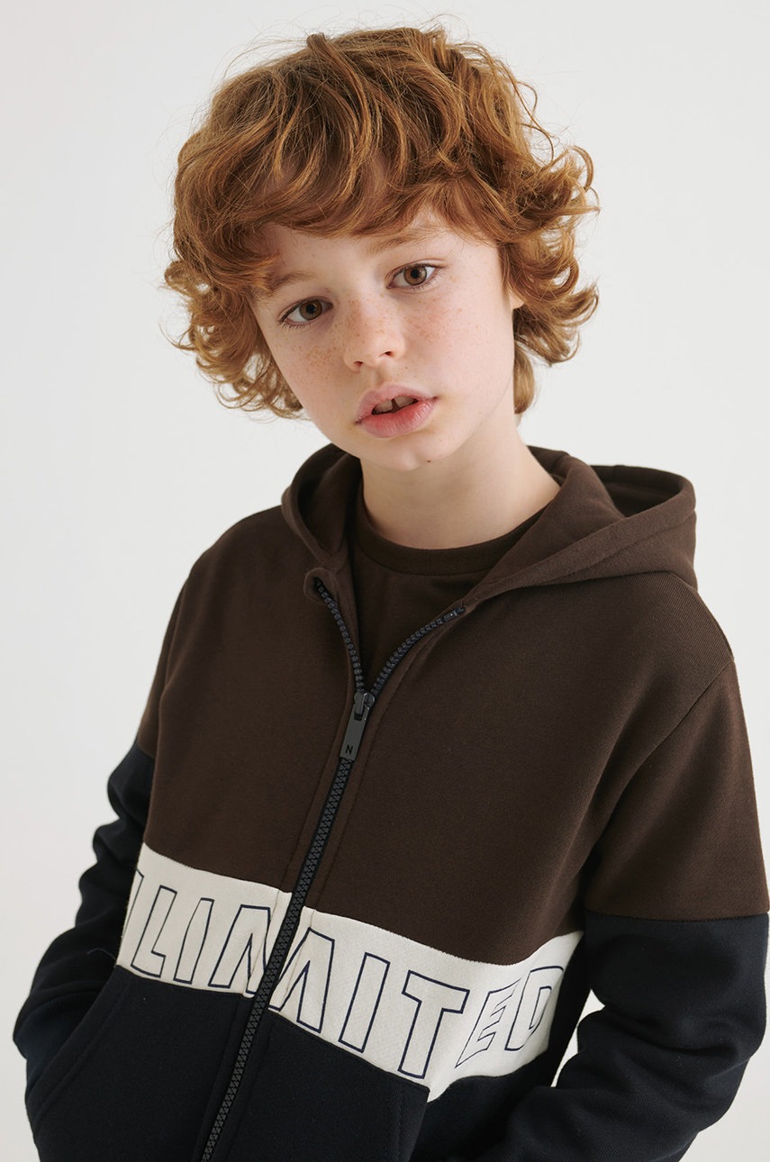 Bluza pentru copii cu gluga din colectia Mayoral. Model care se incheie cu fermoar confectionat din tesatura.