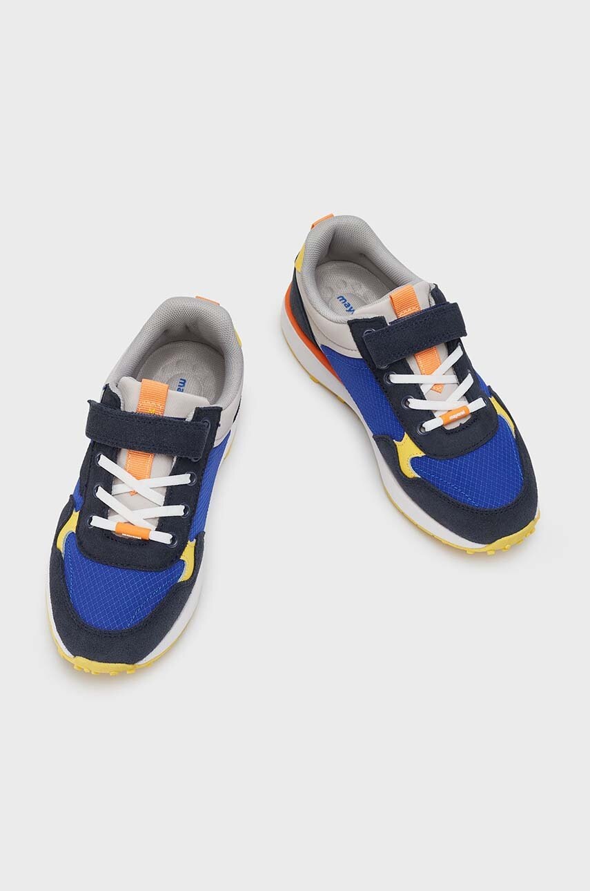 Sneakers copii din colecția Mayoral. Model confecționat combinatia materialului textil cu pielea intoarsa.