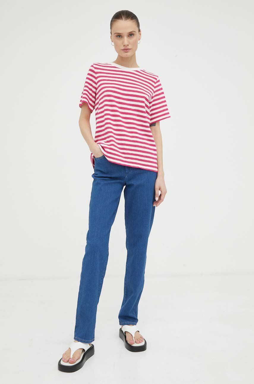 Jeansi din colectia Wrangler cu fason straight cu talia inalta. Model confectionat din denim confortabil. Material flexibil, confortabil.