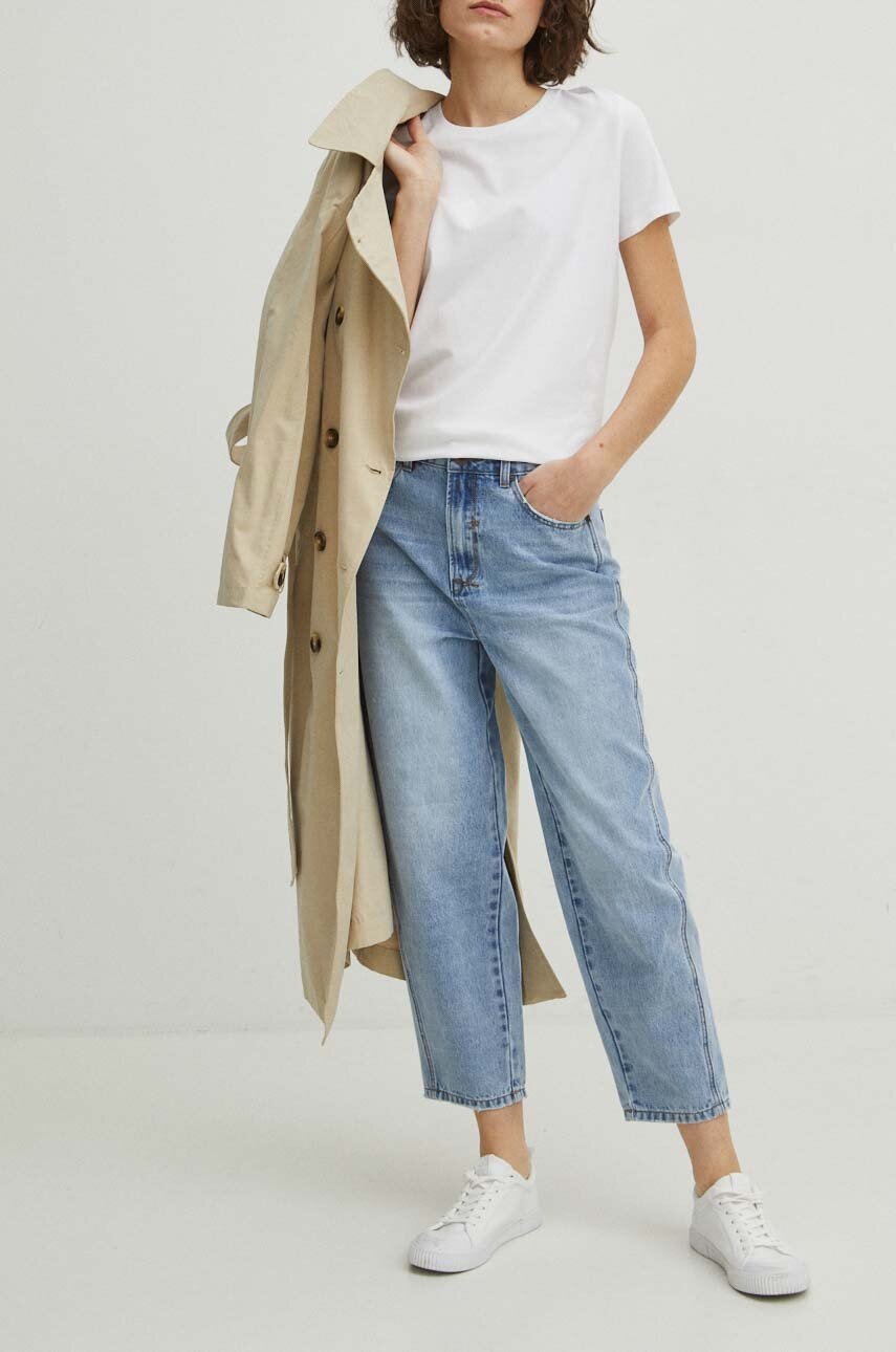 – Croiala moale – blugii se caracterizeaza printr-o croiala oversize, pliuri pe linia soldului si un picior lat care se ingusteaza la glezna. Forma lor mai relaxată nu restricționează mișcarea, garantând confort și comoditate. – Talie regulata. – Incheiere cu nasture si fermoar. – Buzunare oblice. – Denim spalacit decorativ. – Latimea in talie: 36 cm. – Latimea in solduri: 50 cm. – Inaltimea taliei: 31 cm. – Latimea in partea de jos: 18 cm. – Lungimea interioara a piciorului: 66 cm. – Dimensiunile date pentru marimea: 36.