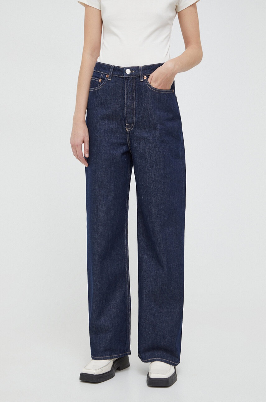 Jeansi din colectia Samsoe Samsoe cu fason wide cu talia inalta. Model confectionat din denim spalacit. Rigid, tinand cont de forma materialului.