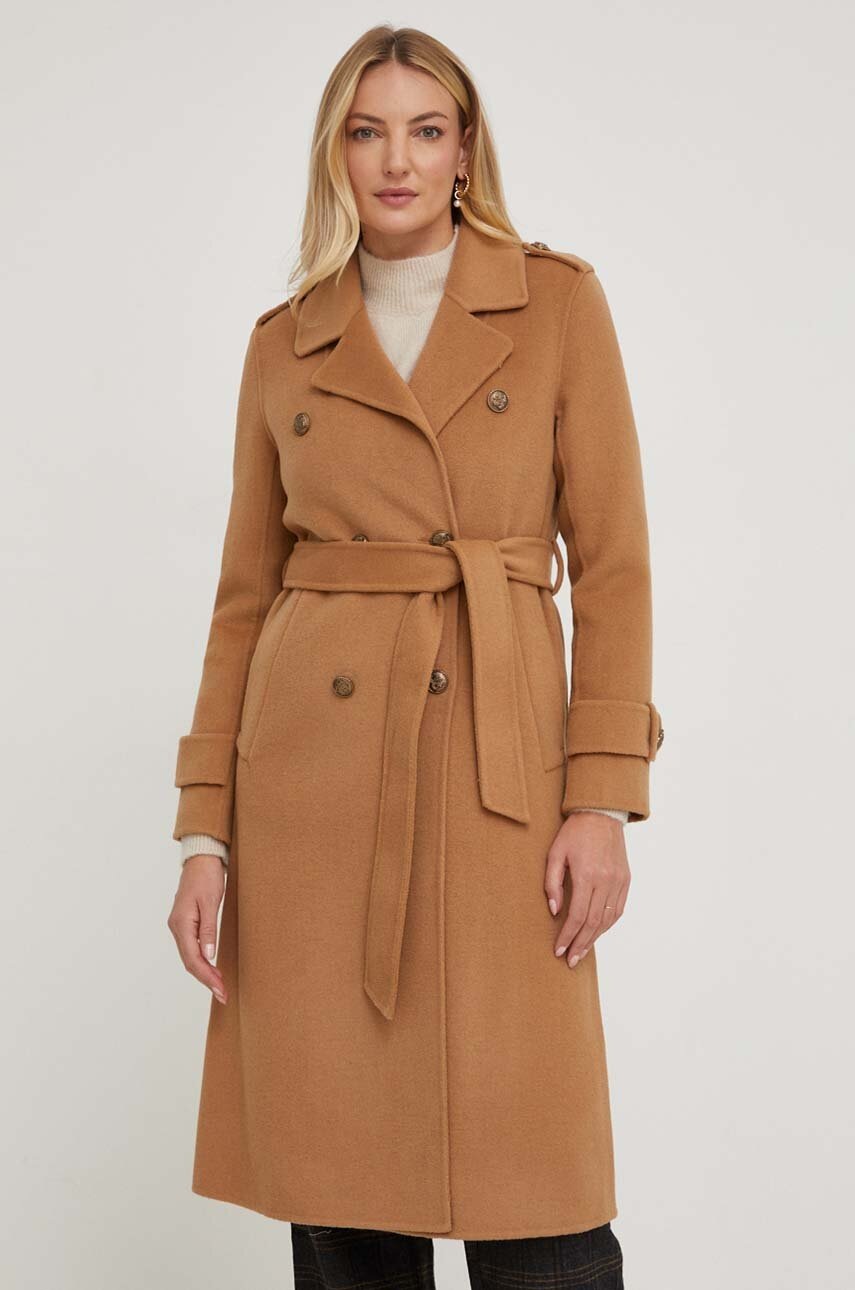 BOSS palton de lana culoarea bej, de tranzitie, cu doua randuri de nasturi