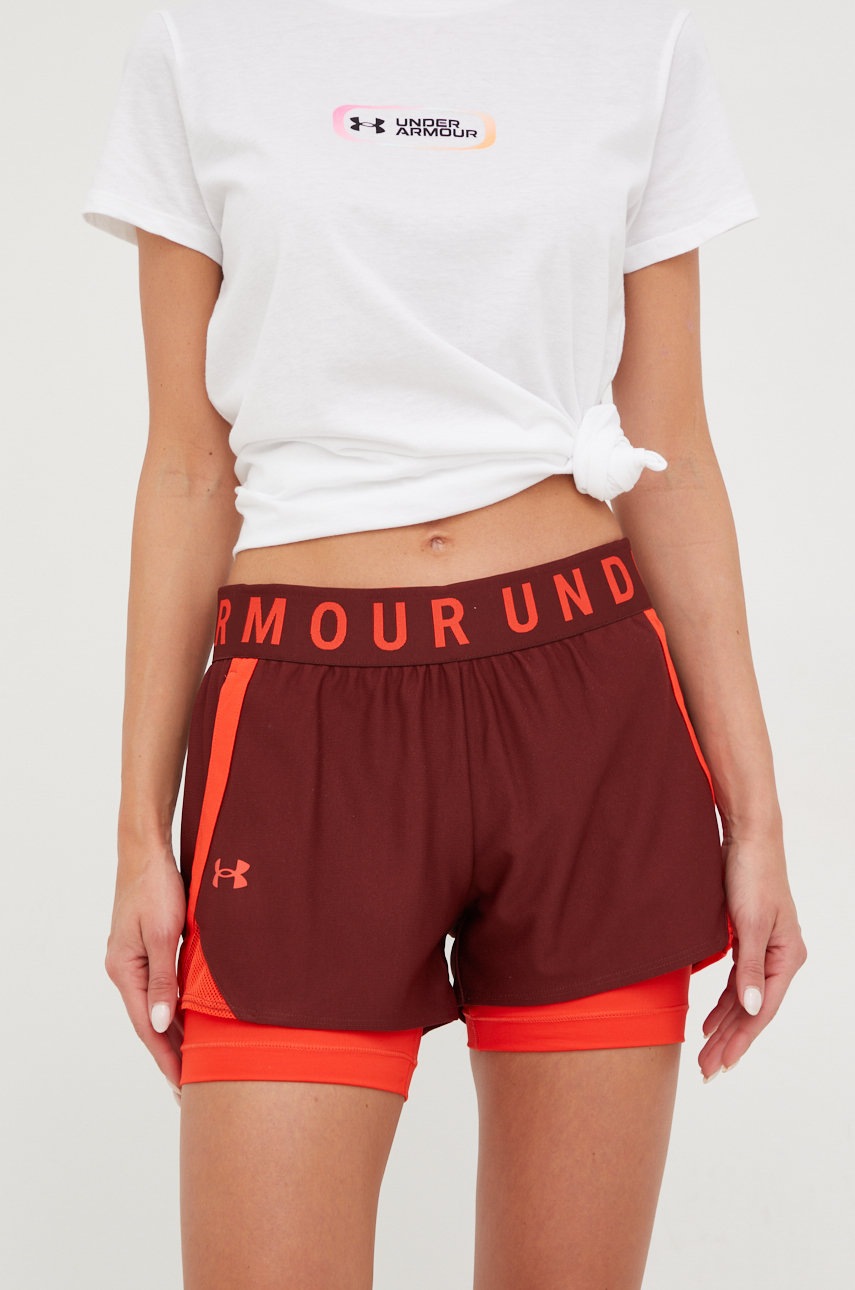 Under Armour pantaloni scurți de antrenament femei, culoarea bordo, cu imprimeu, high waist 1351981-662