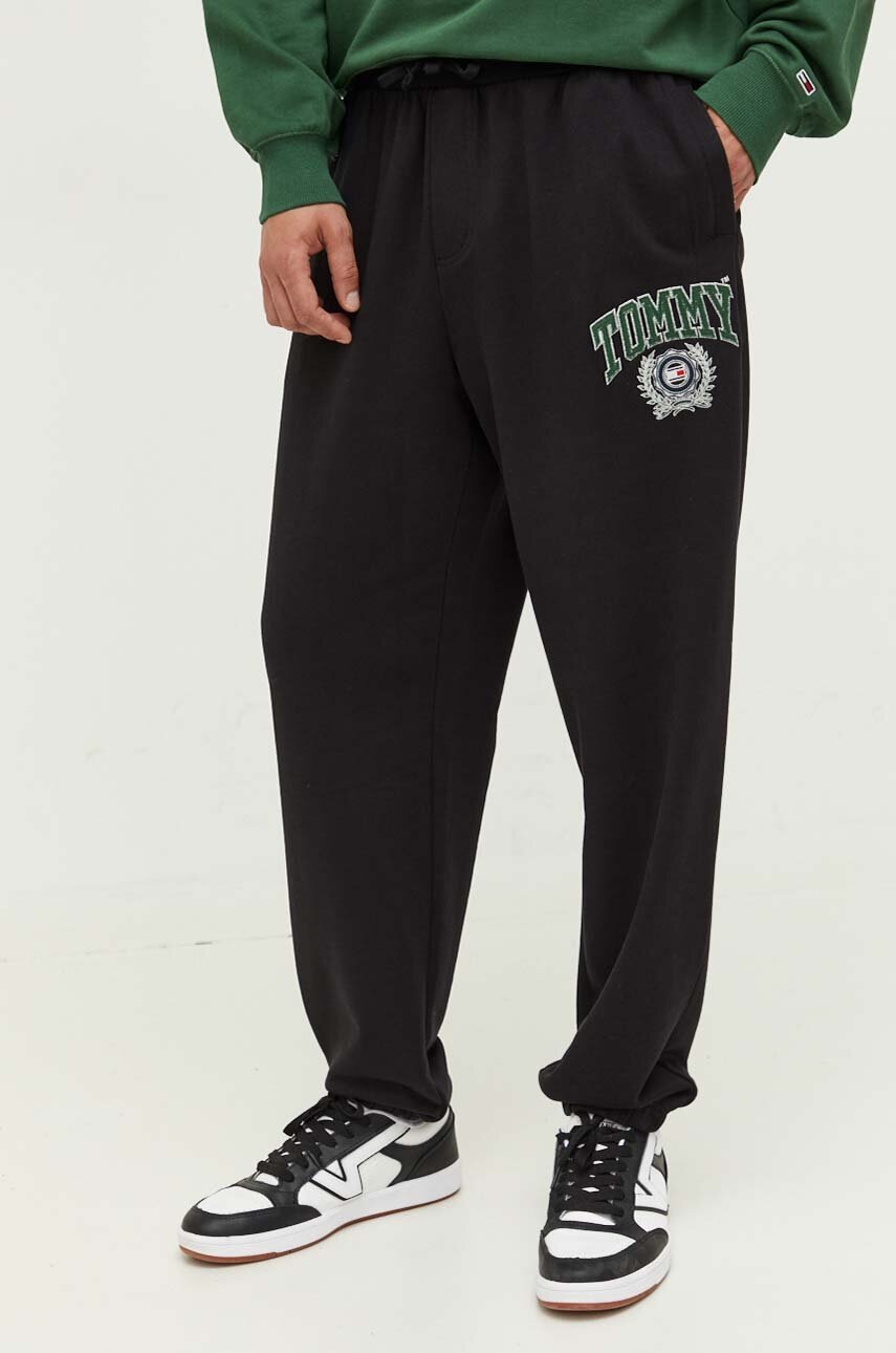 Tommy Jeans pantaloni de trening din bumbac culoarea negru, cu imprimeu