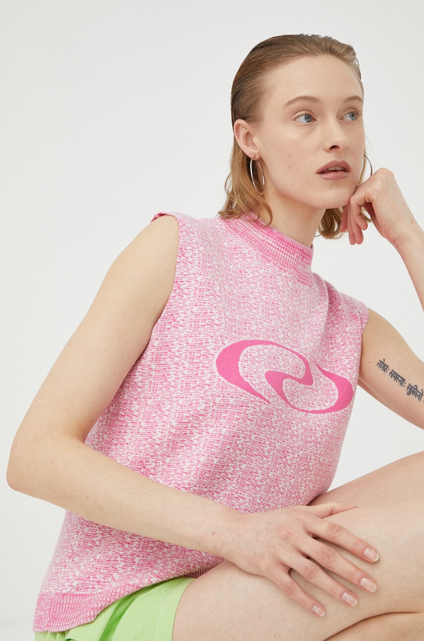 – Decolteu rotund. – Tesatura elastica. – Finisaj din manseta. – Fason drept. – Tricot ornamentat. – Lungimea: 58 cm. – Latimea la subrat: 48 cm. – Dimensiunile date pentru marimea: S.