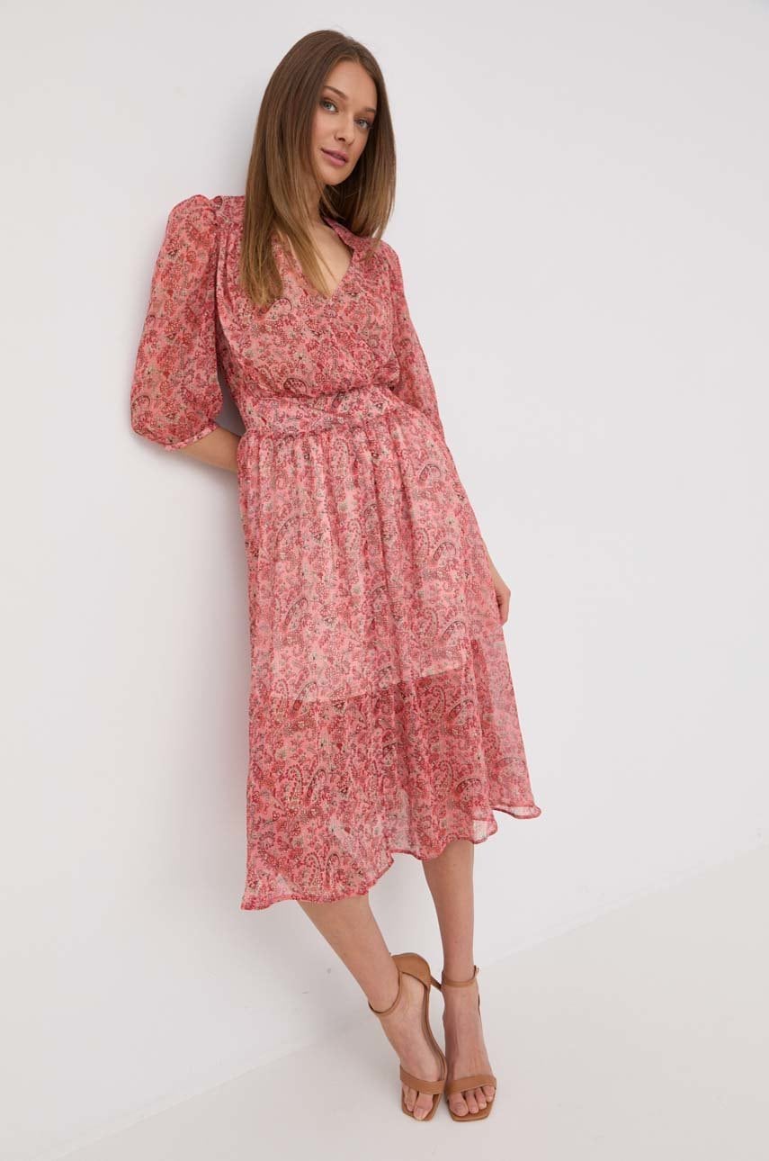 – Model cu captuseala. – Incheiere cu clema. – Maneca trei sferturi. – Decolteu in V. – Banda elastica in talie. – Stofa subtire, inflexibila. – Lungimea: 115 cm. – Latimea la subrat: 51 cm. – Dimensiunile date pentru marimea: 36.