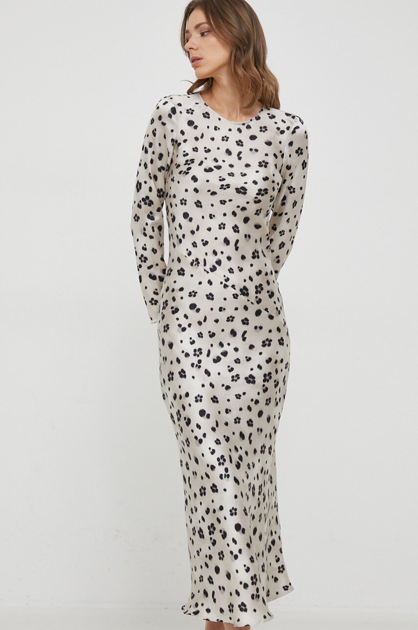 Rochie din colecția Sisley confecționat din tesatura ornamentata. Datorită conținutului de poliester, materialul este mai rezistent la cute.