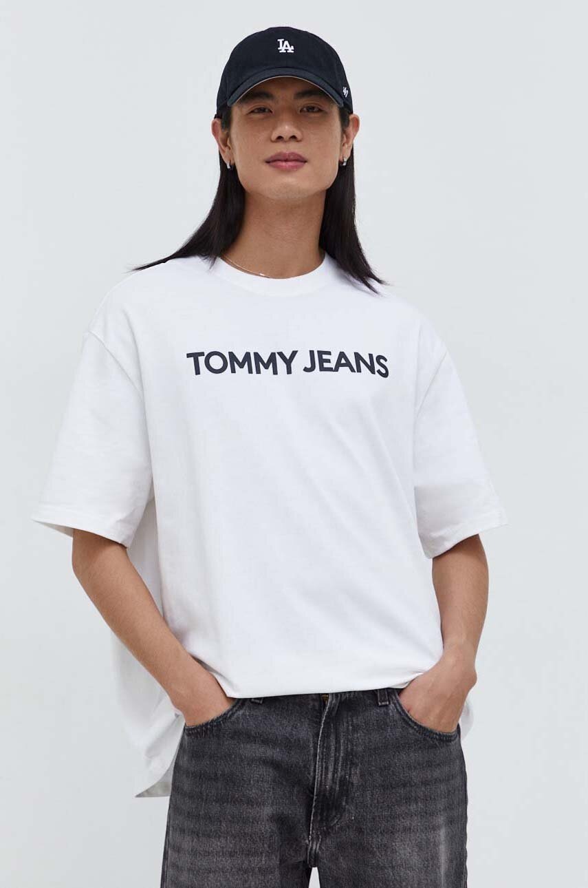 Tommy Jeans tricou din bumbac barbati, culoarea alb, cu imprimeu