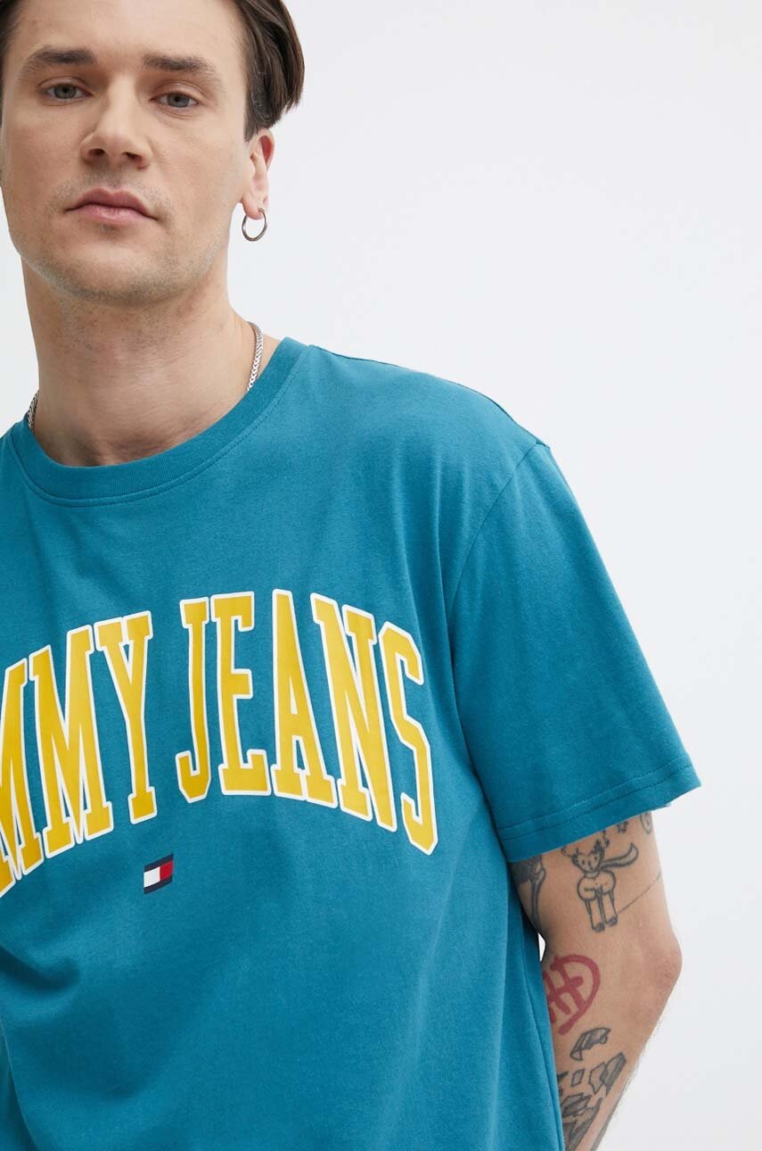 Tommy Jeans tricou din bumbac barbati, culoarea turcoaz, cu imprimeu, DM0DM18558
