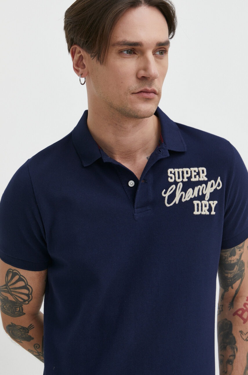 Superdry polo de bumbac culoarea albastru marin, cu imprimeu